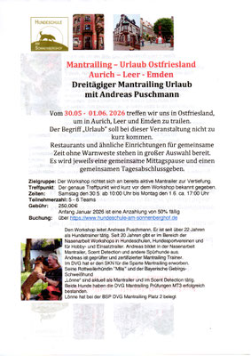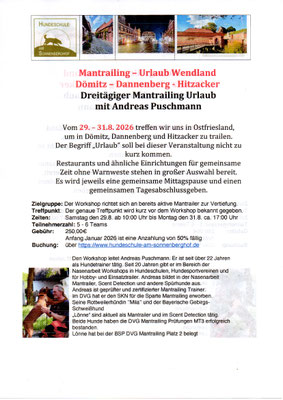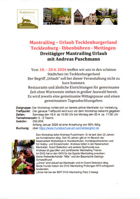 Gebühr: Zweitagesworkshop 100,-€ pro Teilnehmer mit Hund